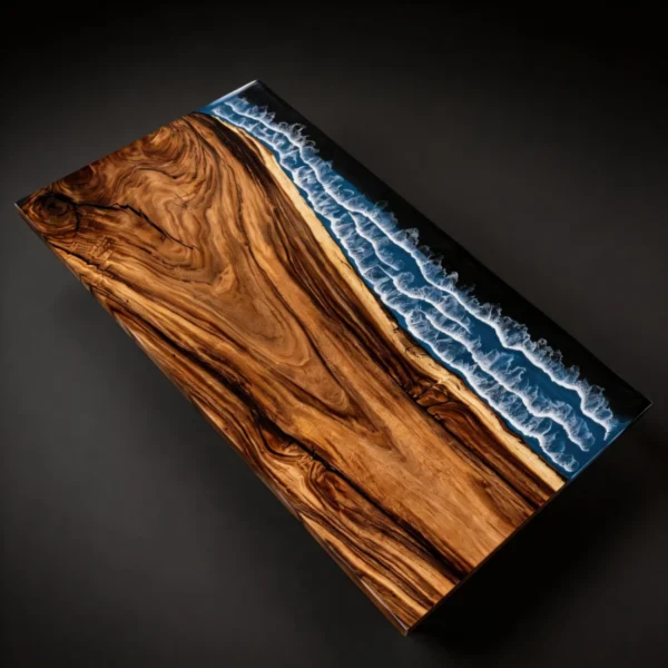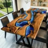 Custom Navy Blue Resin River Walnut Table with Ocean Fish Details-HTM-1